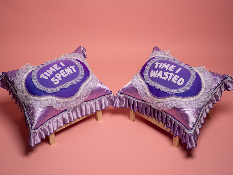 Surface all the way through is a collection of sculptures made from discarded materials that look like pillows. While making this work with her sewing machine and knitting machine, Richardson was ruminating on waste, superficiality, sentimental materialism, distraction, accumulation and containment.